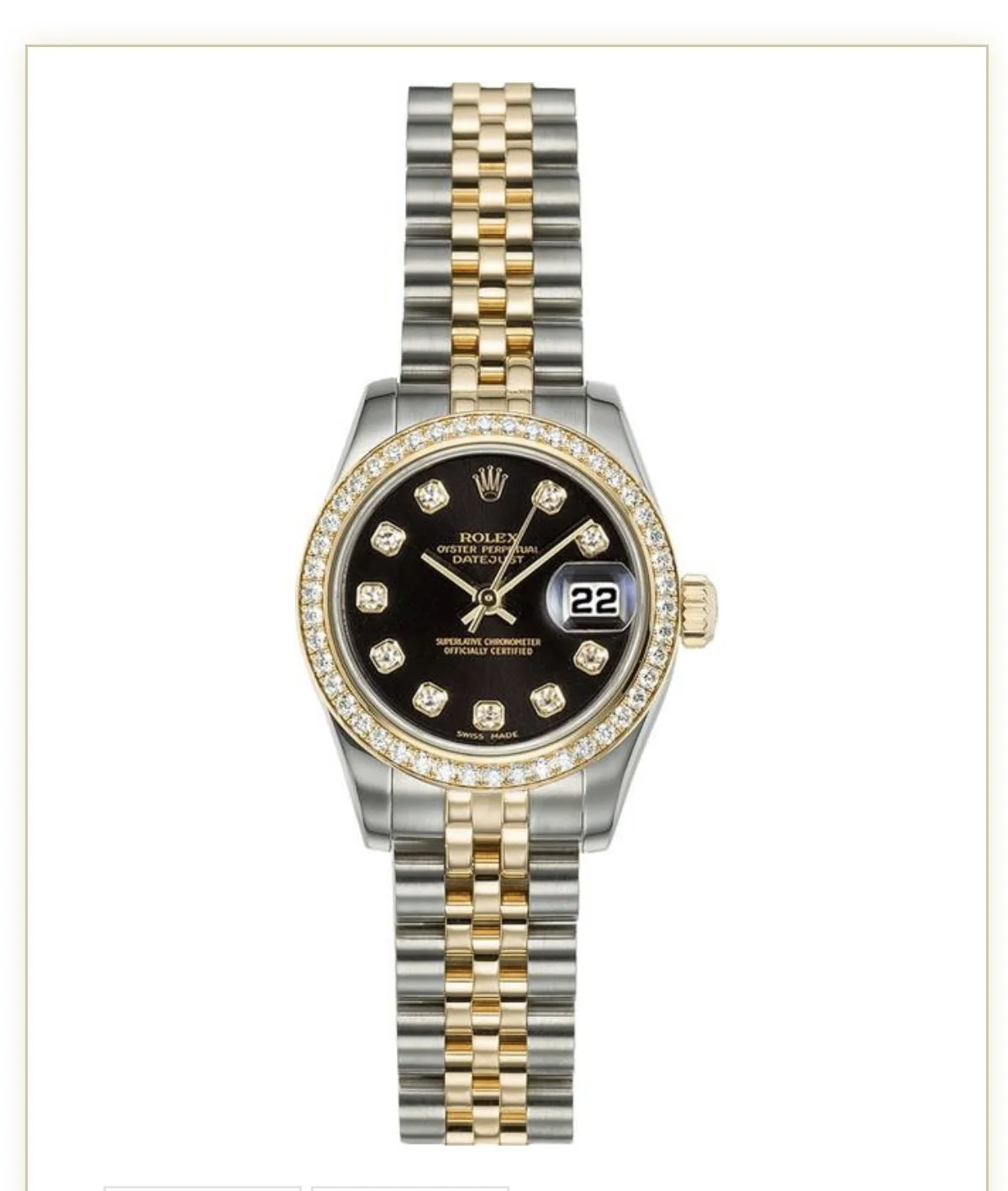 Watches › Date just black face with diamonds two tone 36MM watch only Image 1 of 1 Date just black face with diamonds two tone 36MM watch only $205.00 Add To Cart Added!