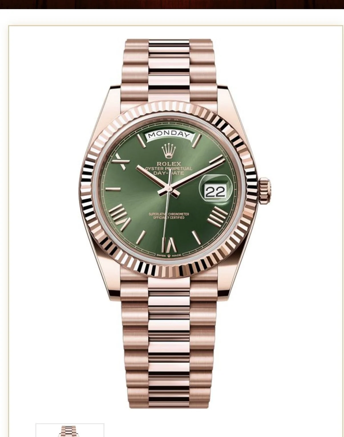 Watches › Presidential Rose, gold Olive, green face day, date box and papers Image 1 of 1 Presidential Rose, gold Olive, green face day, date box and papers $245.00 Add To Cart Added!